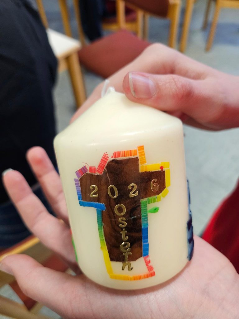- über das Kreuz hinaus (16.04.2026) - - Eine Erfahrung aus der Karwoche begleitet mich durch die Osterzeit:In einer Gruppe gestalten wir eigene Osterkerzen. Das junge Mädchen mir gegenüber ist… Weiterlesen