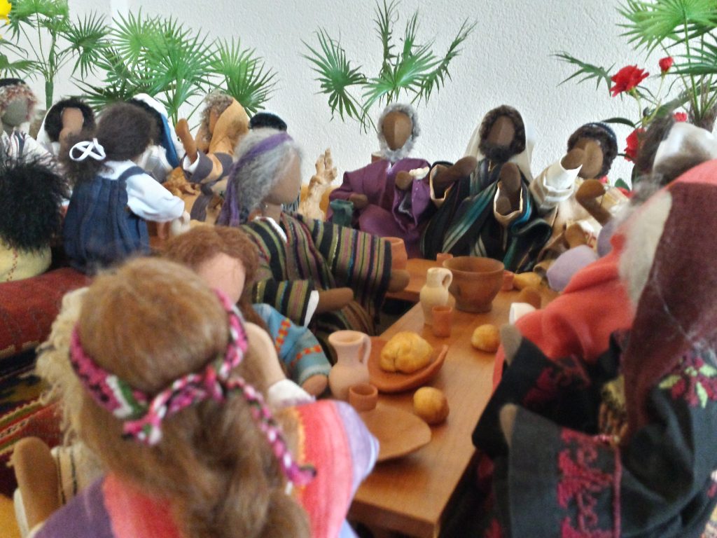 Zum Mahl geladen sind Männer und Frauen, Jung und Alt, Reich und Arm, Fromme und Sünder, …. alle sind geladen.Als Jesus seinen Jüngern die Füße wäscht sagt Petrus : „Niemals sollst du mir die Füsse waschen.“Judas verät Jesus mit einem Kuss.Soldaten sind gekommen, um Jesus festzunehmen.Jesus vom Kreuz abgenommen, in den Schoß seiner Mutter gelegtDie Frauen am leeren Grab