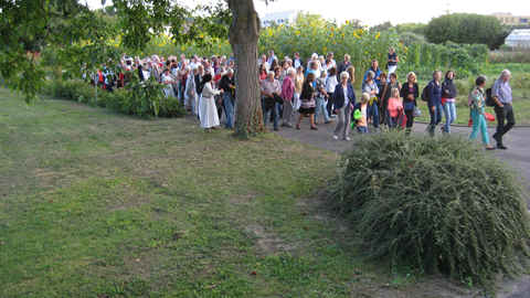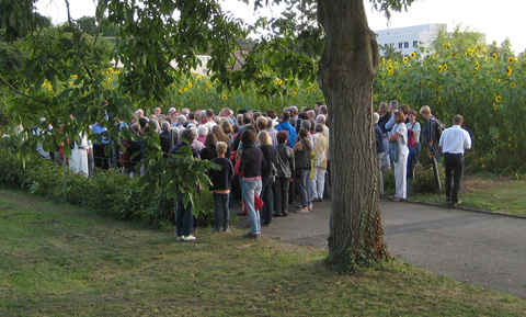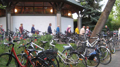 Der Aufenthalt in der kleinen Kapelle wurde musikalisch mit Taizé Gesängen gestaltet. Schwester Helga verwies auf den Anlass der Gründung der kleinen Hausgemeinschaft. Wir Schwestern wollten entsprechend dem Konzil mitten unter den Menschen leben. Mit dem Namen der Kapelle wollten wir auf die vielen Menschen verweisen, die ihr Leben für ihren Glauben eingesetzt haben ohne besondere Erwähnung zu finden. Pfarrer Linvers gab eine Erklärung zur Zeltform der Kapelle. Durch das Konzil war das Bewusstsein, Kirche als wanderndes Volk Gottes, geweckt worden im Gegensatz zu der Vorstellung von der festen Burg. Gott ist mitten im wandernden Gottesvolk, dafür ist das Zelt ein Zeichen. Als wanderndes Gottesvolk machten wir uns meist per Fahrrad auf den Weg zu den zwei weiteren Stationen, Karmel und Kloster St. Magdalena.