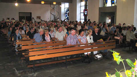 Pünktlich konnte unsere Generalpriorin, Schwester Gisela eine stattliche Zahl der Besucher an der Eingangstreppe des Mutterhauses begrüßen. Die Besucher waren überwiegend mit Fahrrädern zu der „Nächtlichen Kirchentour“ gekommen.