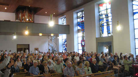 In der Kapelle erwartete uns Schwester Maria-Markus mit einem Vortrag über die Bedeutung der Kapelle als Mittelpunkt unserer Gemeinschaft. Dort wurden wir Schwestern in die Gemeinschaft aufgenommen, dort werden wir bei unserem Tod von der Gemeinschaft verabschiedet. Die Gebetszeiten in der Kapelle strukturieren den klösterlichen Alltag. Sr. Maria-Markus gab auch kurze Hinweise auf die Kunstwerke in der Kapelle. Der Altarraum der Kirche wurde bei der Renovierung nach dem Konzil so gestaltet, dass Ambo und Tabernakel auf gleicher Ebene stehen, um die Gleichwertigkeit vom Tisch des Wortes und vom Tisch des Brotes zum Ausdruck zu bringen.