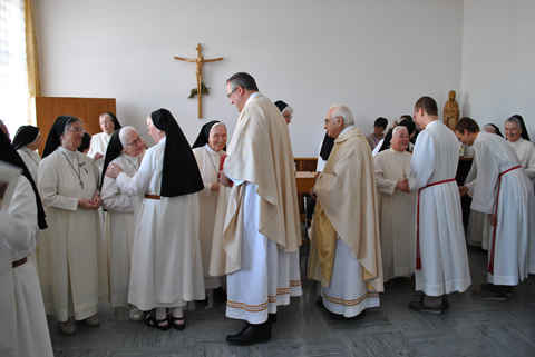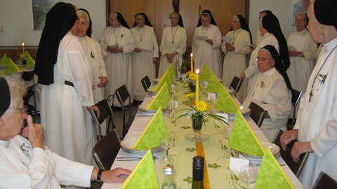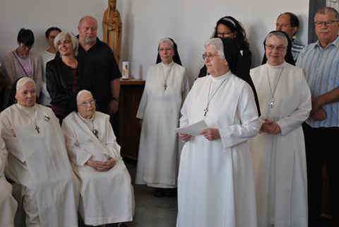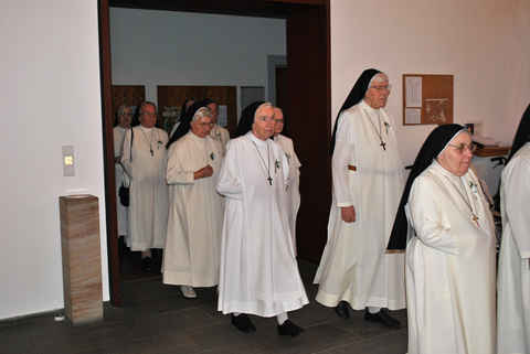 erste R. v. links die Schwestern Waltrud, Reberkka, Fatima, Virgula, Exsulta, Thea; zweite R. v. links die Schwestern Gisela(Generalpriorin), Helga, Miguela, Felicis, Rosemarie, Friedhilde, Albertis, Dominga (Es fehlt Schwester Maria Crucis.)